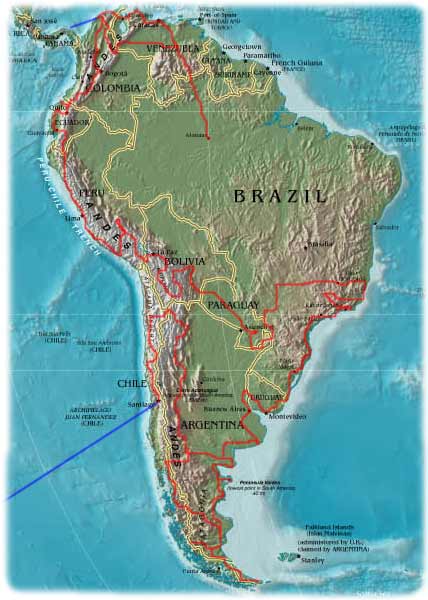 Collecting Pam at the airport was easy and straightforward. Getting maintenance stuff was more difficult, but after a few days I was on my way north to the Atacama region where I crossed the Andes mountains to Argentina. Basically I turned south until I reached Tiera del Fuego, the island at the end of the world where I celebrated the end of the year. The only way to go from there is up. Visiting the glaciers and the 'Caretera Austral' of south Chile', the 'seven lake route' in Argentina, passing Buenos Aires to Uruguay, into Brazil where I followed the coast to Rio de Janeiro and a bit further north. Near Bello Horizonte I circled west and south to the waterfalls of Iguaçu, de Jesuit missions and into Paraguay where I crossed the Grand Chaco to reach Bolivia. In the footsteps of Butch Cassidy, the Sundance Kid and Che Guevara I visited the oldest silver-mine, the largest salt-lake and the most dangerous road in the world. Continuing north into Peru's Machu Pichu and Nazca, followed by Ecuador and colonial Colombia. South again into Venezuela to see Angel Falls and further to Brazil and the Amazon river. Back to Colombia to search for the lost city and a sailing-boat to take me across the Darien Gap.