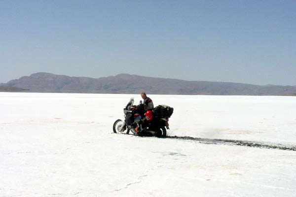 Riding a salt-lake can be fun. It can also be very muddy and difficult to get out of. After getting out of there I spend the next hours to find a place with water, a hose and a bucket to wash all the salt off.