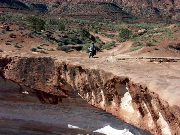A 100 km trail following the cliff of 'Canyon lands NP'. No sign, no fence and a 100 meter drop. Not very USA-like. They do have some strange rules here. One dirt-biker fell down on this trail and received a citation of 100 U$ for being 'unable to maintain control over the vehicle'. Strangely enough the same ranger wished me a pleasant day after finding out I was camping illegally in the park.