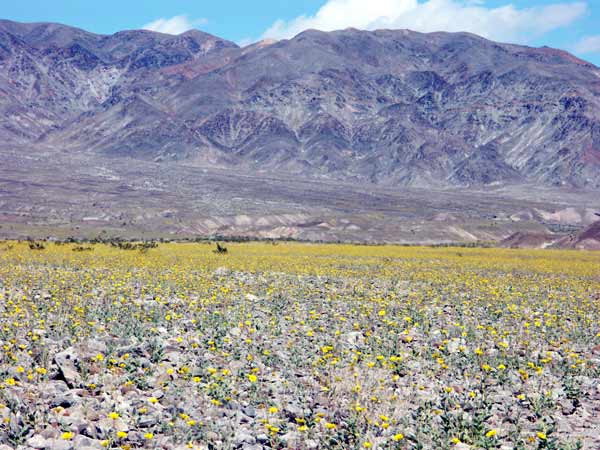 Not what you would expect from one of the hottest and driest places on earth, but the freaky weather that had pestered me from the moment I arrived in the USA had also provided rain for a rear phenomena: Death Valley in blossom. Unfortunately the result was a stream of over a thousand motor homes that filled up all campsites and parking lots.