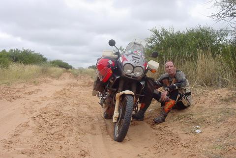 I rode out and immediately the narrowness of the track bordered me. Thorny bushed were ripping at my arms. My mirrors were smacking against branches and my bags scraped along bushes and sand-walls which enclosed me on both sides. When I saw the first bad piece coming up I was startled. Slowing down I would never make it. It was a deep trench. Maybe one meter deep and so there was no room for my legs if I wanted to push or peddle. The sides were just to high. In despair I completely opened the throttle and in second gear I literally blasted my way through the sand, the branches, the thorny shrub, and anything which was in my way. I was sure I would rip my tires to shreds, but they surprised me by staying in one piece and by not being punctured by the thorns which were al around me.