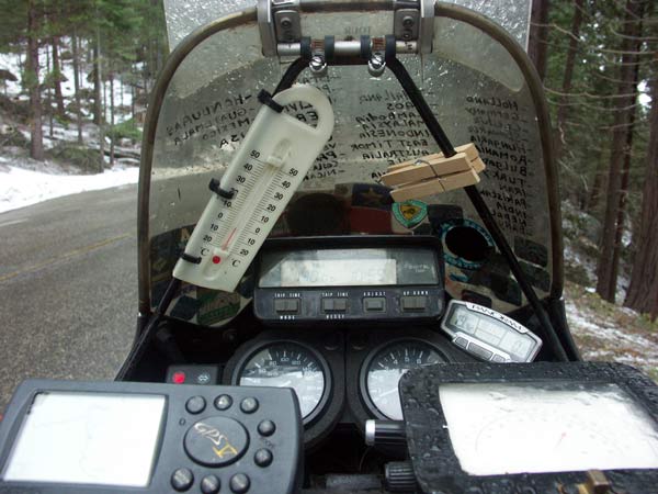 I entered the valley with on a nice, warm sunny day. I wandered around the scenic waterfalls. I climbed a bit of 'El Capitan' and generally enjoyed the incredible scenic area. Until I woke up in the snow the next morning. No more views, no more sun. Time to move on. Notice the thermometer on the dash.