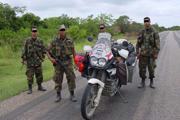 When ever you meet soldiers that have guns but no markings or insignias on their uniforms it's a good idea to be friendly and helpful. After trying to fit their truck-killer on Pam and sharing a bottle of cold water they did not mind being on the photograph as long as it was not published in Colombia.