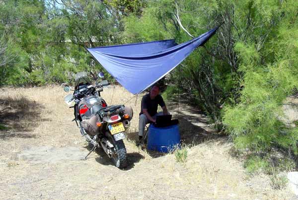 Preparing for a slideshow on a borrowed laptop, fed by Pam's battery.