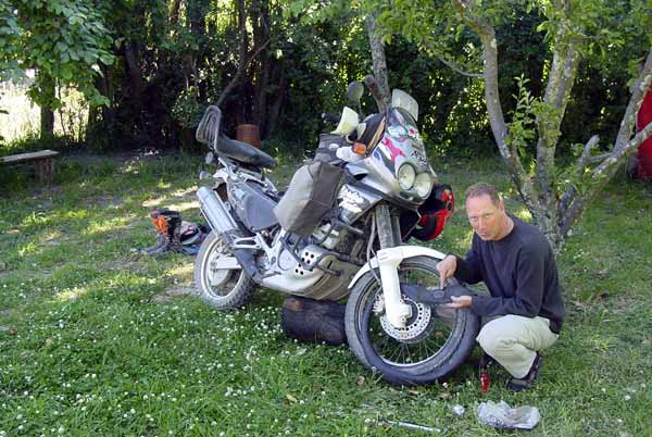 I am lucky when it comes to flat tires. First of all, I did not have al lot of them and second, they mostly happened at convenient times and places. Here in porto tranquilo on the caretera Austral I discovered the flat front while having breakfast.