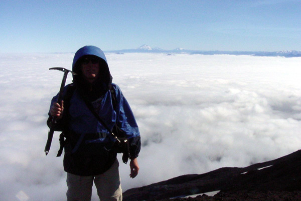 Not even halfway up and a long way above the clouds. The sun is burning but the air is freezing. A difficult combination to cope with.